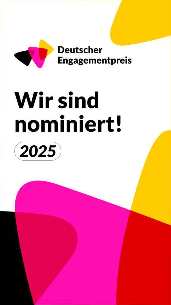 Unsere Initiative hat bereits einen Preis am 01.02. 2025 beim Ideenwettbewerb Ehrenamt 4.0 des Landes Rheinland-Pfalz erhalten und konnte deshalb durch die Staatskanzlei Rheinland-Pfalz für den Deutschen Engagementpreis nominiert werden. Denn an diesem Dachpreis dürfen nur Preisträger:innen der über 650 Auszeichnungen für freiwilliges Engage- ment teilnehmen. Die Nominierung bringt unsere Arbeit auf Bundesebene in den Fokus und wir freuen uns, zu diesem starken Netzwerk von Engagierten zu gehören.