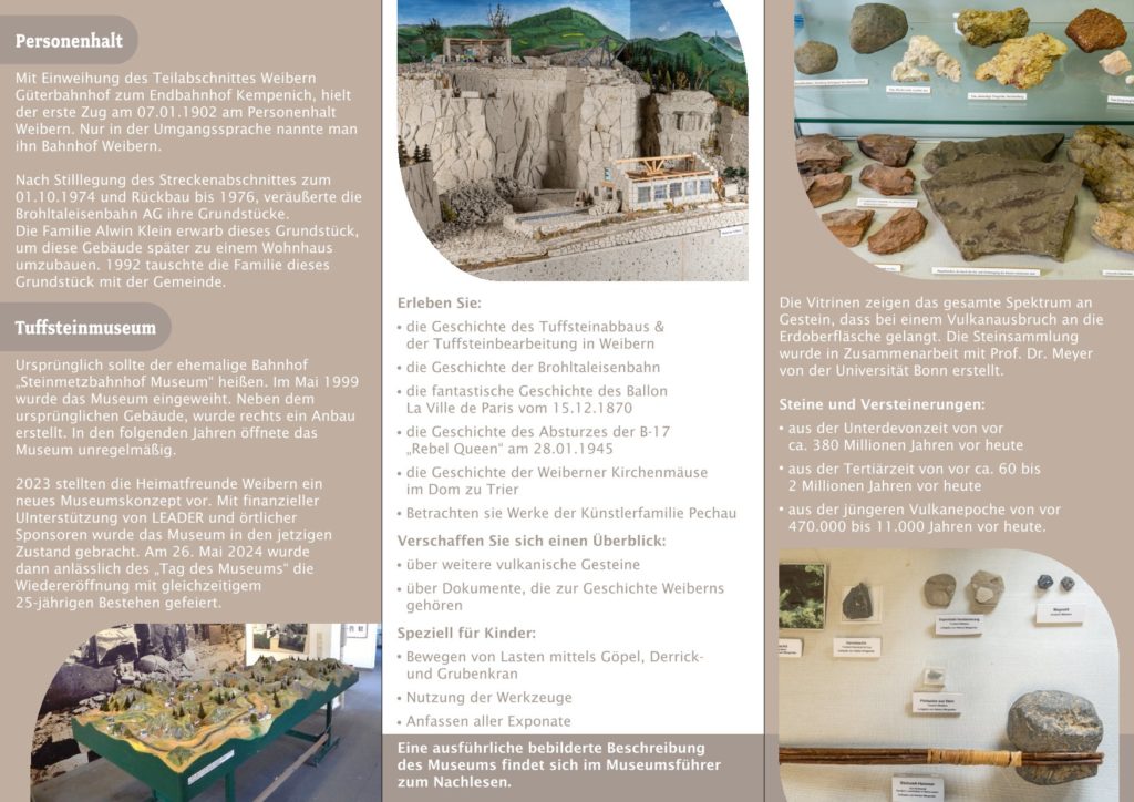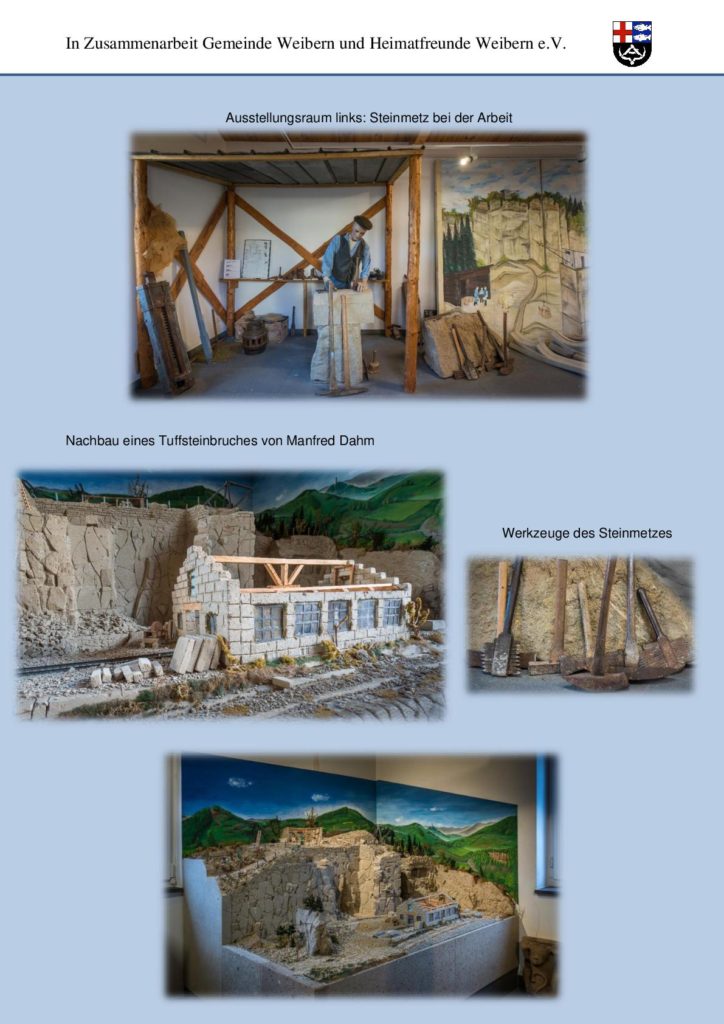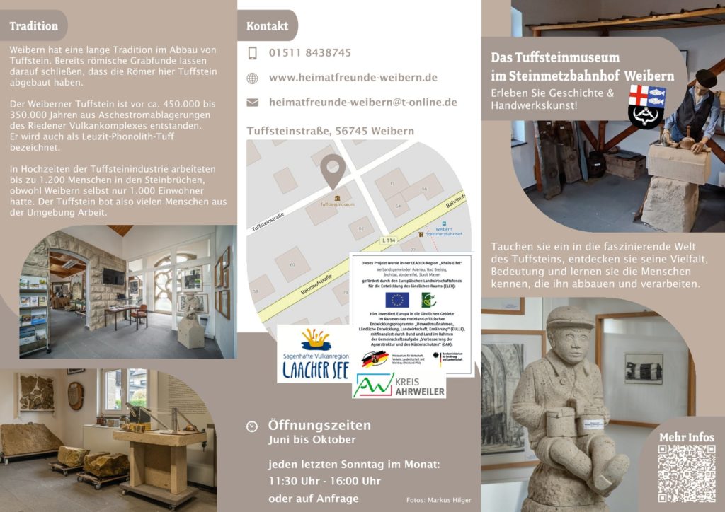 Das Tuffsteinmuseum öffnet im Zeitraum Juni bis Oktober jeweils am letzten Sonntag im Monat in der Zeit von 11:30 – 16:00 Uhr oder auf Anfrage. Telefon: 0151 18438745 oder email: heimatfreunde-weibern@t-online.de.